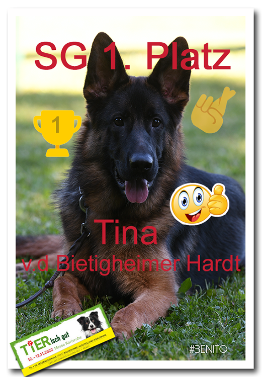 Körbericht: Große, sehr gut pigmentierte Hündin mit hohem Widerrist, geradem Rücken und betont geneigter Kruppe, sehr gute Hinterhand, gute Vorhandenwinkelung, tiefe Unterbrust, gerade Front, bei fester Gelenkbildung hinten eng, vorne gerade tretend zeigt sie genügend raumschaffende Gänge. Wesen fest, TSB ausgeprägt.